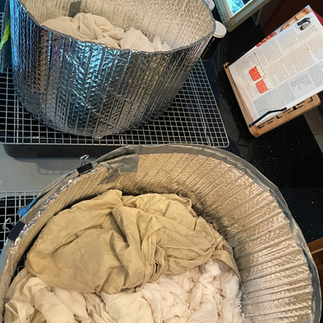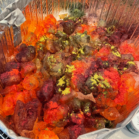 Now, with ice dyeing, the concept is similar but you have a secret weapon you use to create the most amazing designs. This magic tool is ice. So, you start off in a similar fashion…folding/crumbling/tying your garment but instead of squirting the dye onto it, you let the ice do most of the work. As you can see in the following pictures, the process involves adding a layer of ice on top of the garment (and I do use differently shaped ice cubes to alter the effects!) and then sprinkle the dye directly onto the ice. The ice breaks the colors down into their components as it melts (note: this is not a technical white paper about ice dye and since I am not a chemist, I’m leaving it at that level of specificity) So, if you put red and blue together to create a patriotic apron, you may end up with purple, red, blue, green and who knows what else. The outcome amazes me to this day.